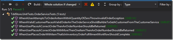 37: Assert.AreEqual(expectedOrderId, result); 38: Mock.Assert(_orderDataService); 39: Mock.Assert(_orderFulfillmentService); 40: } By now the code in this test should be very familiar and easy to understand. This test is very similar to the WhenUserPlacesOrdeWithItemThatIsInInventoryOrderFulfillmentWorkflowShouldComplete test; I’ve added a second item to the shopping cart. I’ve also arranged a mock on the order fulfillment service mock for the call to IsInInventory for the second item. To make sure that IsInInventory is called for both items I’ve added the OccursOnce condition to both calls and will assert the mock was called correctly at the end of the test.