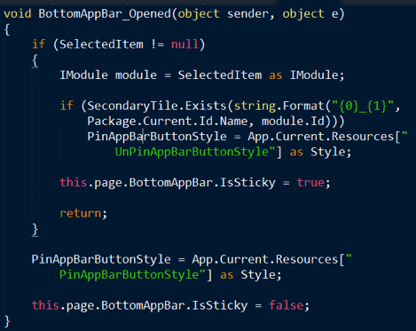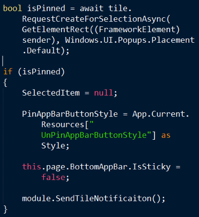 You should show the user an indication whether or not the tile is already pinned. I have to flip the style based on the pinned status and mark the bar as sticky otherwise it will close as soon as the user loses focus and the popup dialog is shown. This behavior is similar to the Windows 8 start menu when trying to delete an app. The following listing shows the event handler that gets executed when the user invokes the app bar.