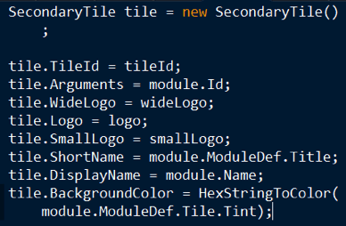 Now moving back to PinToStartScreen method, I first create the three logos that will cover the available form factors for a tile. I also need to create a unique id for the tile that will let me navigate back to the module that represents the tile. Finally, I set the background color, short and display name for the tile as well.
