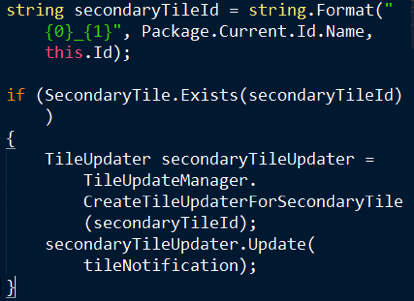 Secondary tiles can also have notifications similar to that of a regular tile. This requires you to set the content xml in a similar way. The only difference is with the method that is used for creating the updater. Since it’s a secondary tile, I have to pass the unique id that was used to create the secondary tile as well.