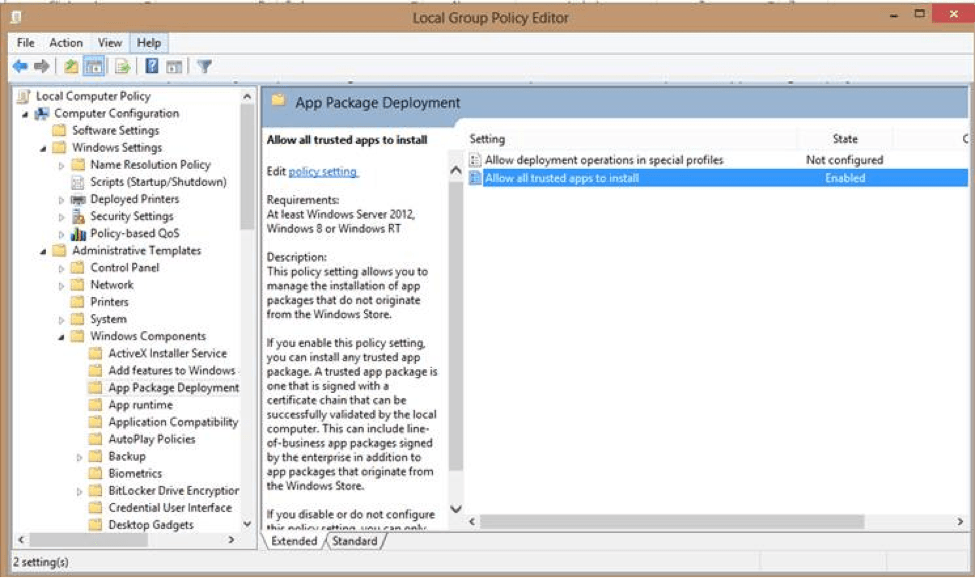 Before you install the app from the company portal, you also need to confirm that your device is enabled for installing sideloaded apps. To do this, go to the search charm (Win + Q) on your device and type gpedit.msc. Execute the application and it will prompt you with the following dialog: